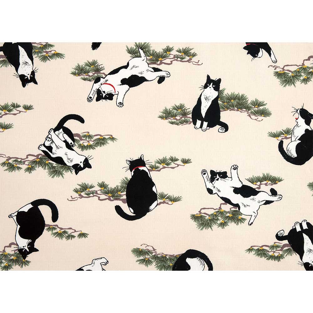 [ドビー]節のあるスラブ糸で織られた布を使用。縁起の良い松に猫組み合わせたユニークなプリント。バッグやインテリアなどにしても。