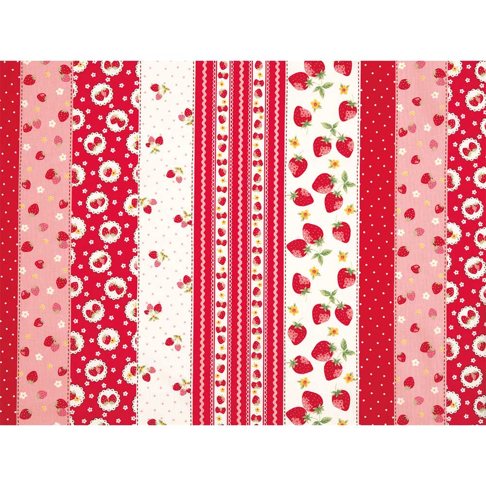 いろいろないちご柄のリボンを並べたようなキュートなストライプ柄プリント。大きないちごのストライプは約7cm幅。ハッピーメッセージコレクション。