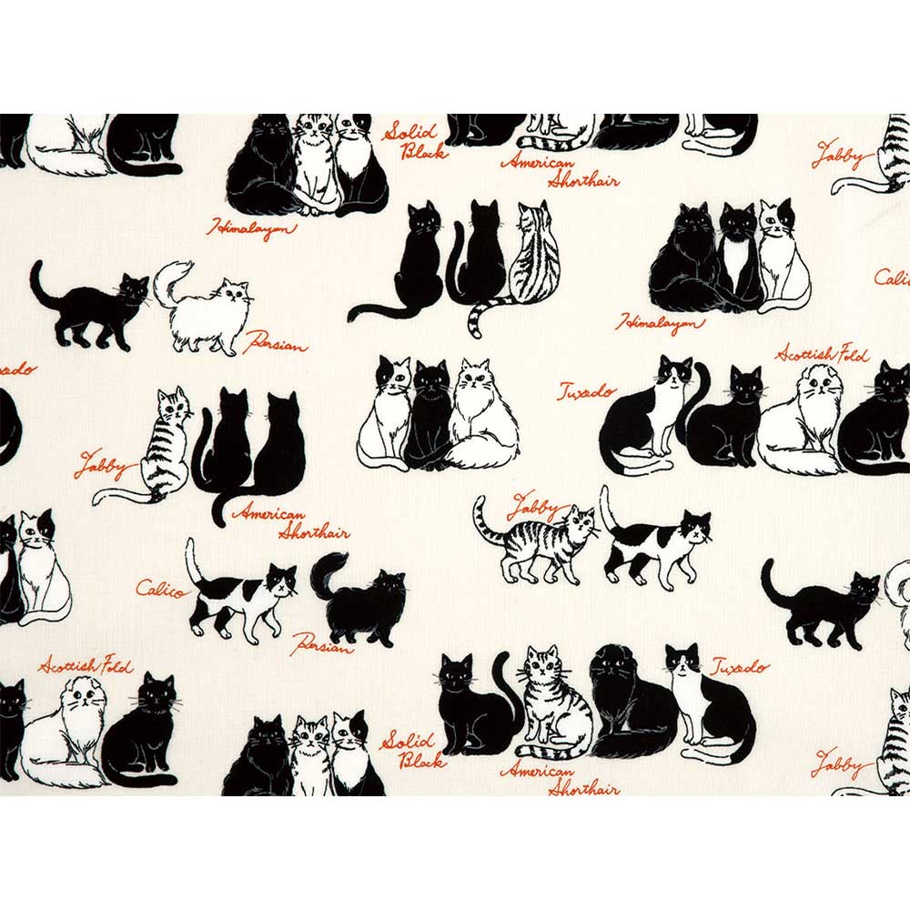 三毛猫やハチワレ、スコティッシュフォールドなど、いろいろな種類の猫をモノトーンで描いた見ているだけでも楽しいプリントです。