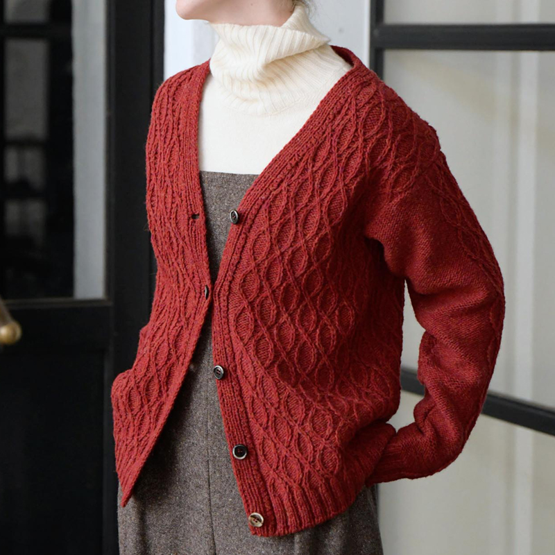 裏目に浮き上がる1目交差のケーブル模様が、凛として美しいデザイン。華やかな色目のトップスがひとつあると、着回しの幅が広がります。ボトムスを選ばないツィードは、しっかりとした張りがあり、暖冬の今、アウターとしても大活躍。