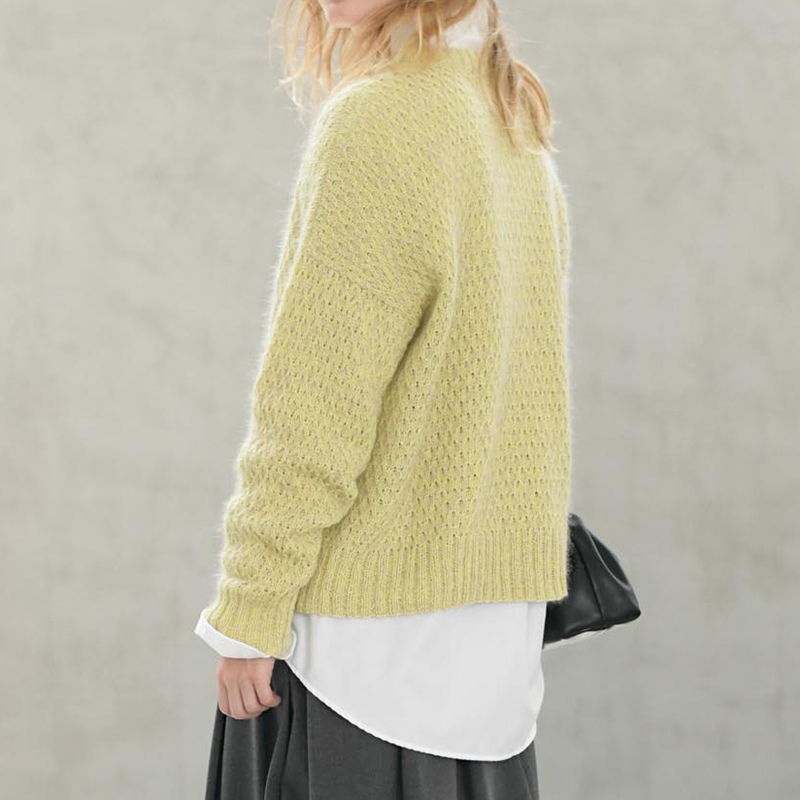 シンプルながら美しい地模様は、1目交差と思いきや、2目一度を利用した模様で薄く仕上がります。2種類の糸が紡ぎ出す、春の野のようなニュアンスのある色合いも素敵です。