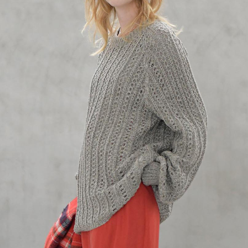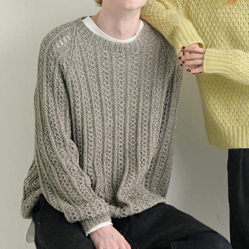 高低の引き上げ編みを組み合わせた模様編みが透け感のあるラインになって、ユニセックスな雰囲気に。彼シャツならぬ彼ニットで、萌えシルエットコーディネートの着回しが堪能できます。