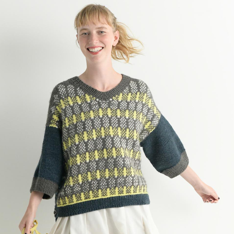 裾丈以外は前後同型の柄違い、2種類の全く違うイメージで着られる編み込みニットです。袖の色をベースにしたカラーリングで前後を上手にまとめています。同じものを2枚作らないので、飽きずに編めるのもなんだか嬉しい。二兎を追ったら、二兎手に入ったお得感。脇はボタンでとめる仕様になっています。