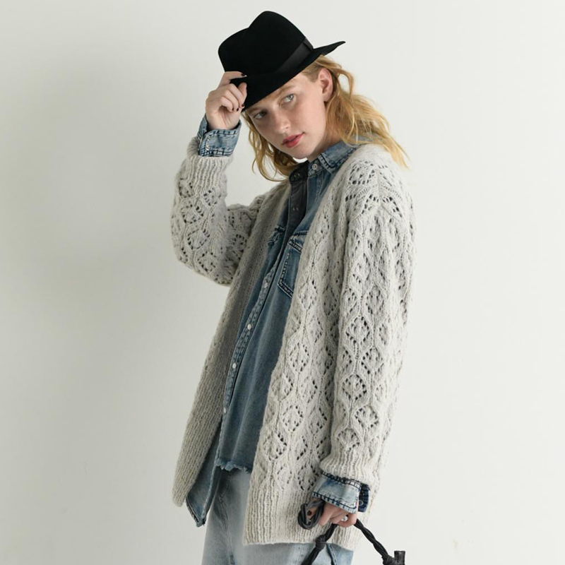 名前の通り、やわらかくて軽い糸で編むニットコート。前立ては身頃と一緒に編むタイプなので、仕上げが楽なデザインです。ボタンがないので羽織りにしても邪魔なものがなく、1目ゴム編みの共ベルトをすれば、きれいにまとまります。