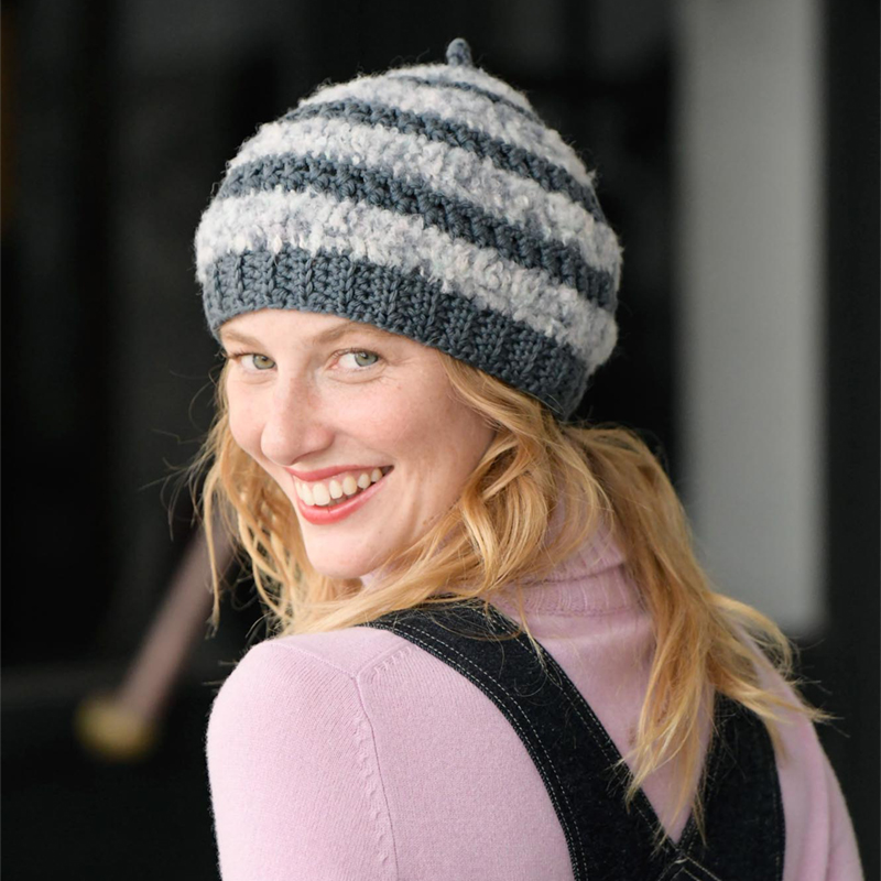 ループヤーンのもこもこをストレートヤーンでサンドした可愛いボーダーの帽子。かぎ針で編むかぶり口は中長編みを横編みに。同じ柄のベストもどうぞ。(このレシピは帽子のみです。)
