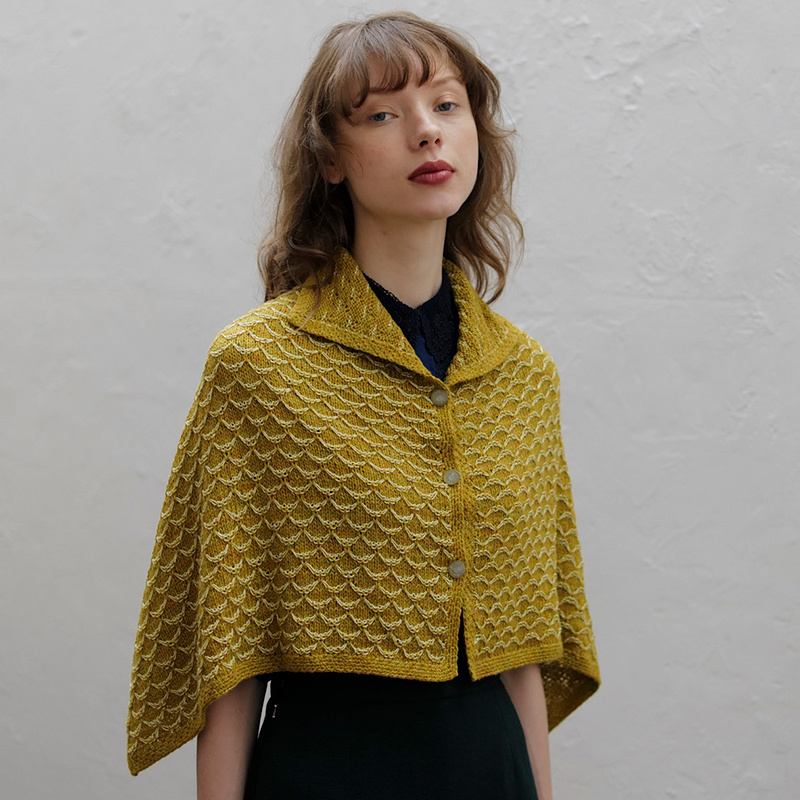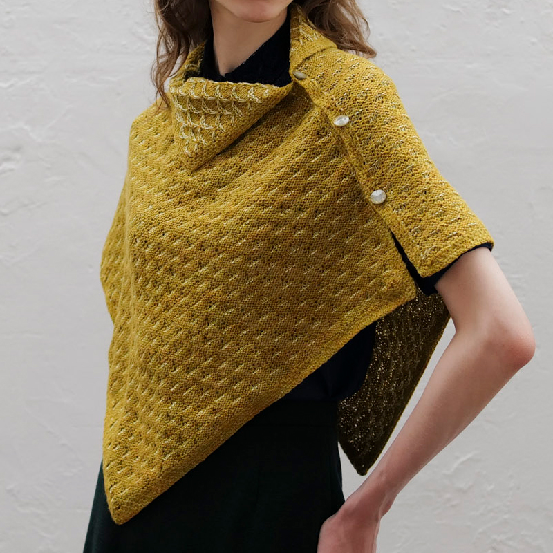 浮き目の中心を引き上げて作る模様がフリルのように並びます。裏側は控えめなラインが走り、衿のように折り返すと裏表の対比が美しい模様に。まっすぐ編むので編みやすく、着方もいろいろ。
