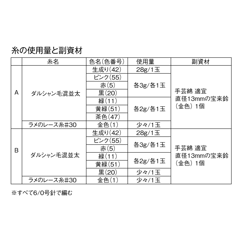 材料:DARUMA ダルシャン毛混並太、ラメの レース糸#30。糸の色名・色番号・使用 量は図中の表を参照してください。