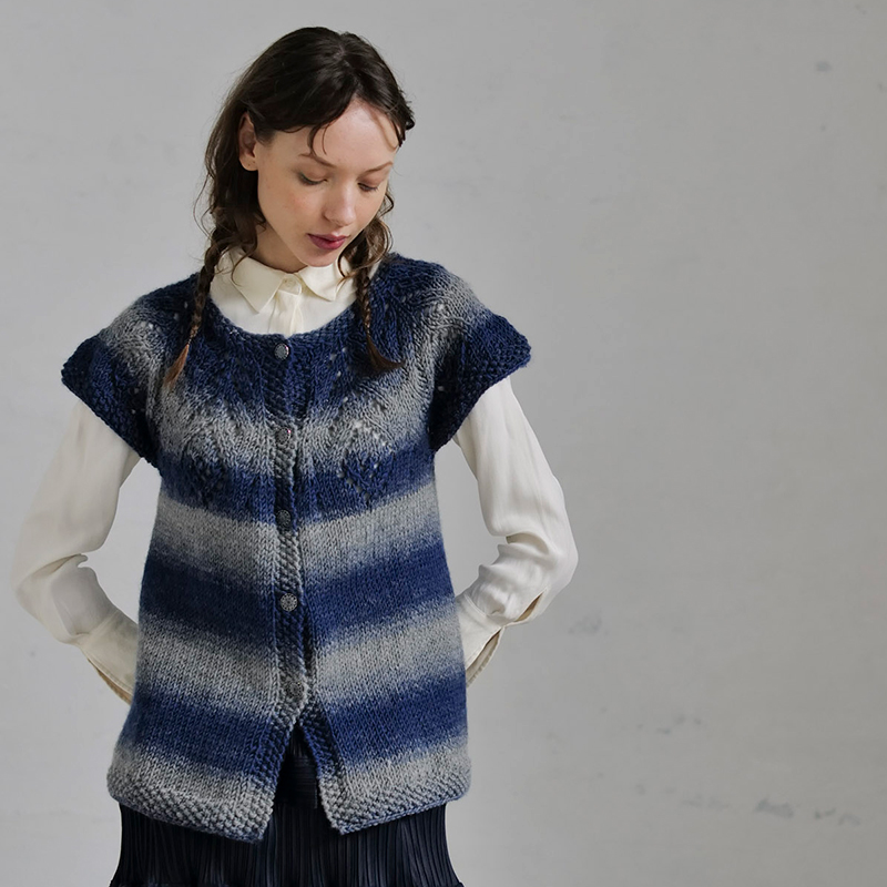 トップダウンの丸ヨークベストは、パンチの効いた太縞が編めるロングピッチの段染め糸で。前立ても続けて編んでいるから縞が崩れず、太糸だから早く編み上がるのも魅力です。ひとつでも可愛い、お気に入りのボタンを並べて。