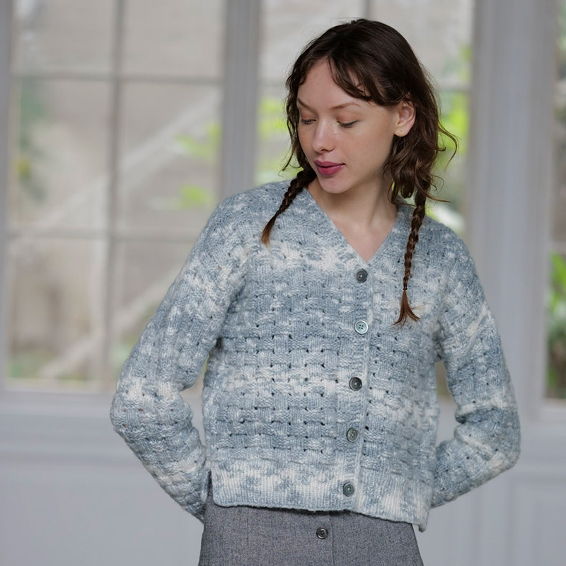 雲の晴れ間を漂うような、ほっこりと癒されるグラデーション。この格子柄、実はバスケット編みでも石畳み編みでもないんです。表目と裏目のブロックにかけ目を入れた、簡単な模様図にびっくり。使いやすい丈感&スリット入りで、ユースフルなカーディガンです。