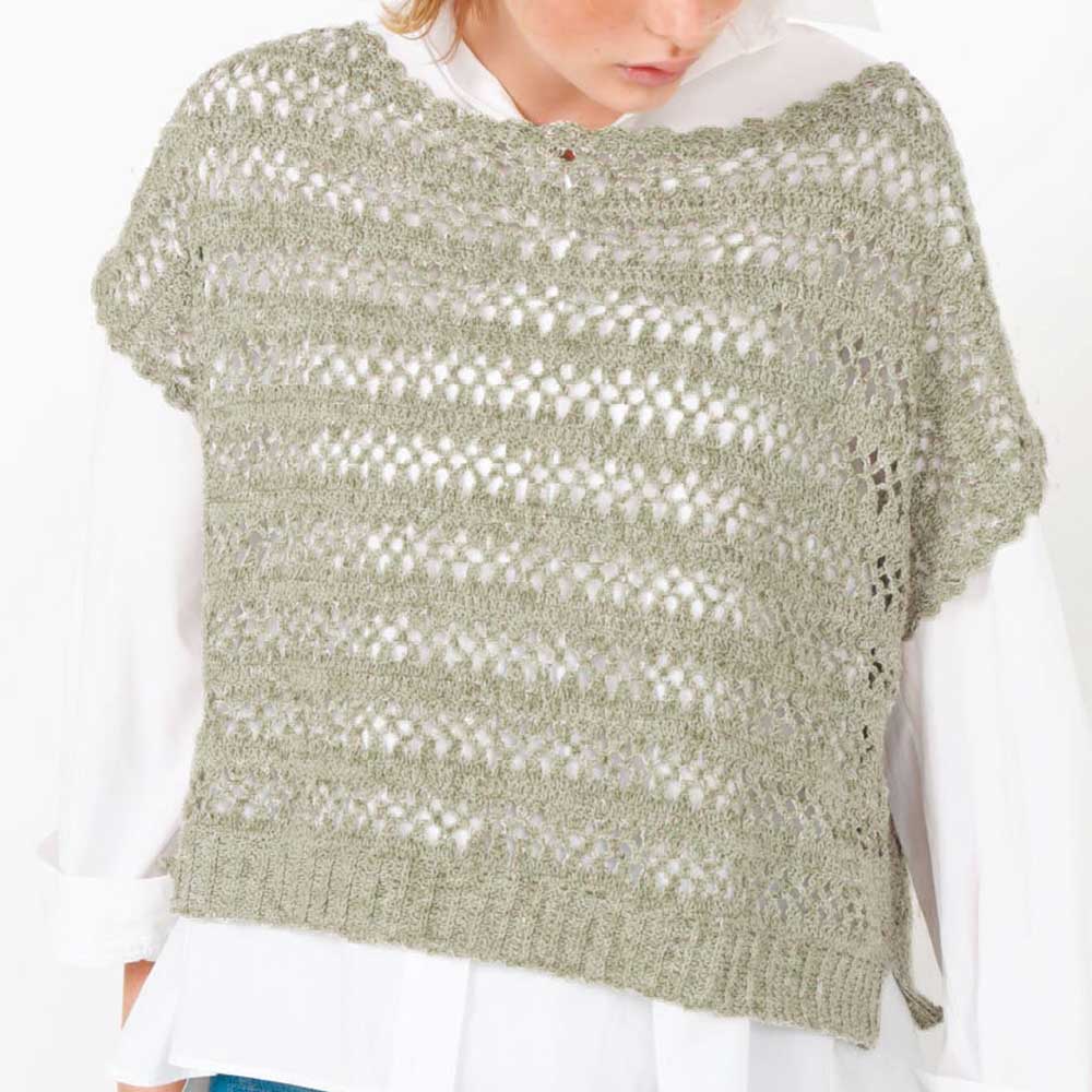 【キット作り方つき】【単品糸購入可】体に沿う、肩下がりの着やすいプルオーバー。ニュアンスグリーンにさりげないラメの入った糸でワンランク上の仕上がりに。シンプルな模様編みで、着回しも抜群です。上級の方へ。