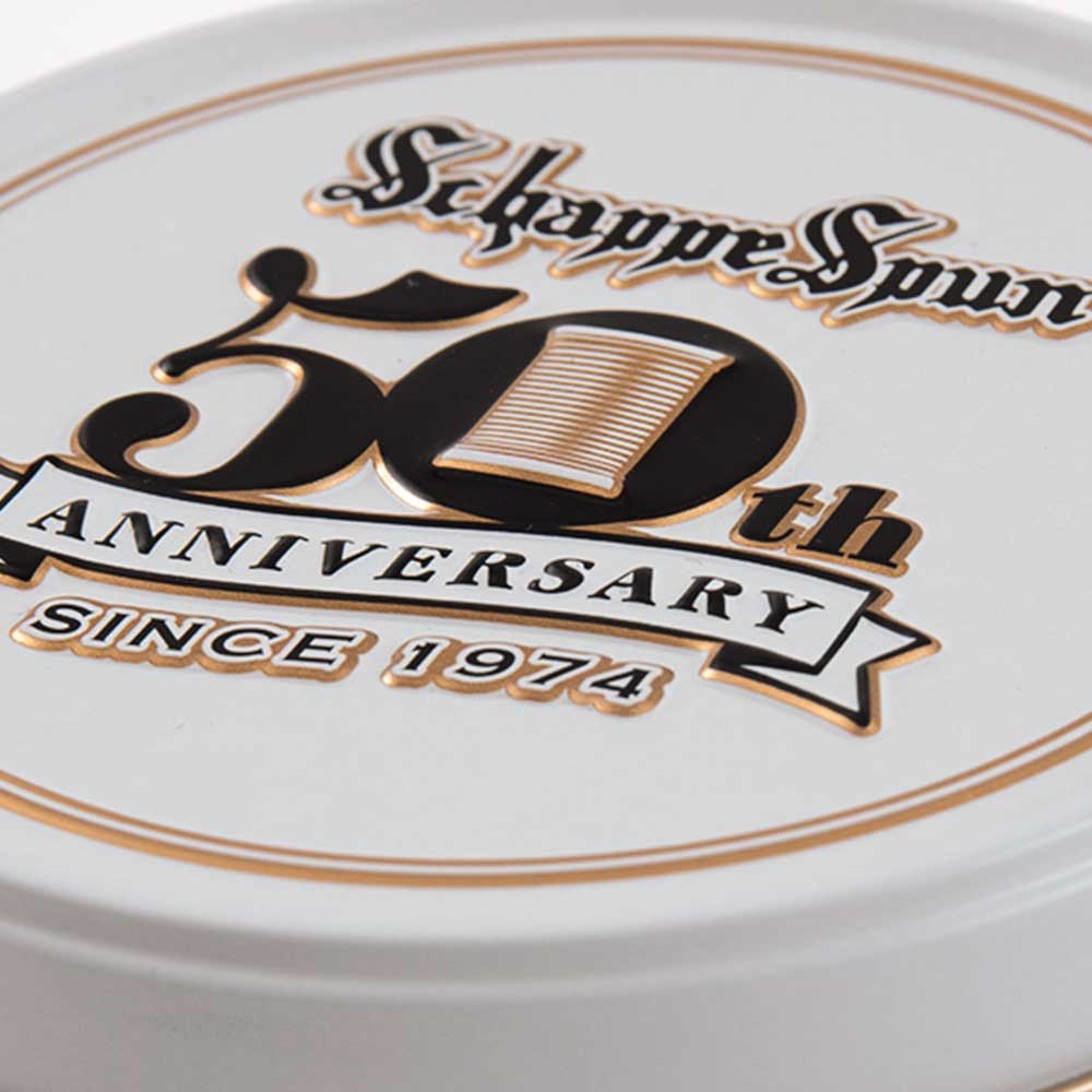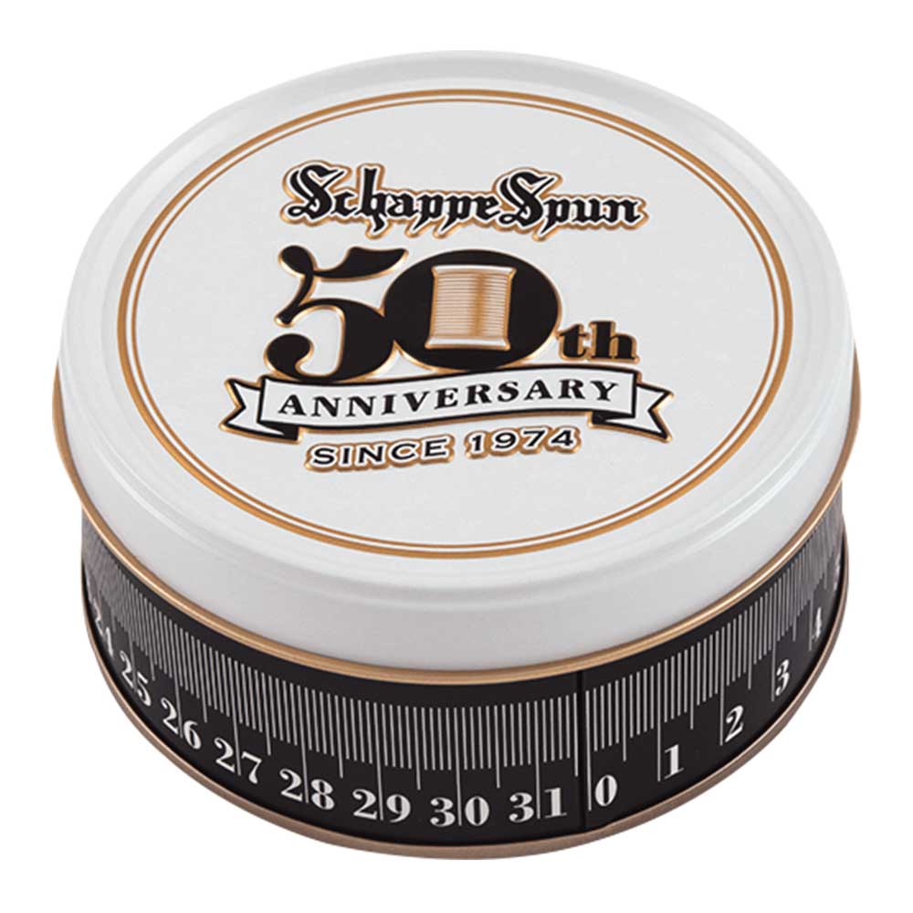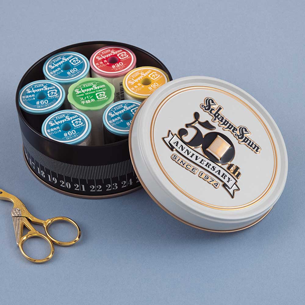 限定100 シャッペスパンの発売50周年を記念して、おしゃれな缶に糸をセットにしました。普通地用、厚地用、薄地用、手縫い用の4タイプをお試しいただけます。糸の豆知識のリーフレット入りでギフトにも喜ばれる限定販売。缶好きの方必見です。糸を出してソーイング缶として使っても便利。ソーイングやパッチワークキルトの仕立てにおすすめ。ふたは高級感のあるエンボス加工、側面はメジャーのデザイン。