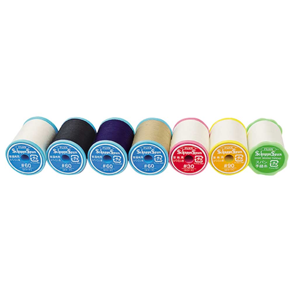 普通地用:糸長200m/60番手(生成・黒・紺・クリーム)各1個、厚地用:糸長100m/30番手(生成)1個、薄地用:糸長300m/90番手(生成)1個、手縫糸:糸長50m(生成)1個 計7個