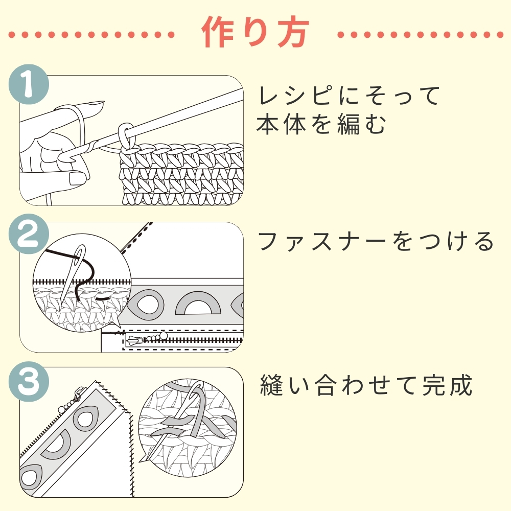 小物入れにぴったりなサイズのレトロでかわいいモチーフのポーチを制作することができます。編み糸ととじ針で、かんたんにファスナーを付けることができ、おうち時間に気軽にトライしていただけます。