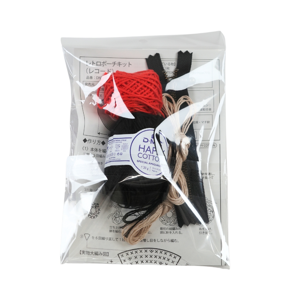HAPPY COTTON(黒1玉、朱色小巻1玉)、刺しゅう糸(ベージュ、黒)、ファスナー(黒)、レシピ