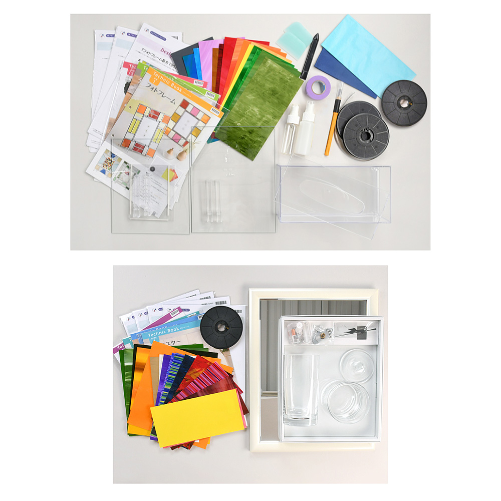 - 前編3作品用:作品図案×3、テクニックブック×3、フィルムセット×1、リード線×2、土台(フォトフレーム、ティッュケース、ガラス板)×各1、前編・後編共通:道具セット(ボーニングペグ、スキージー、霧吹きセット、マスキングテープ、専用クロス、チャコペーパー、リード線カッター、アートナイフ、トレーサー)×1