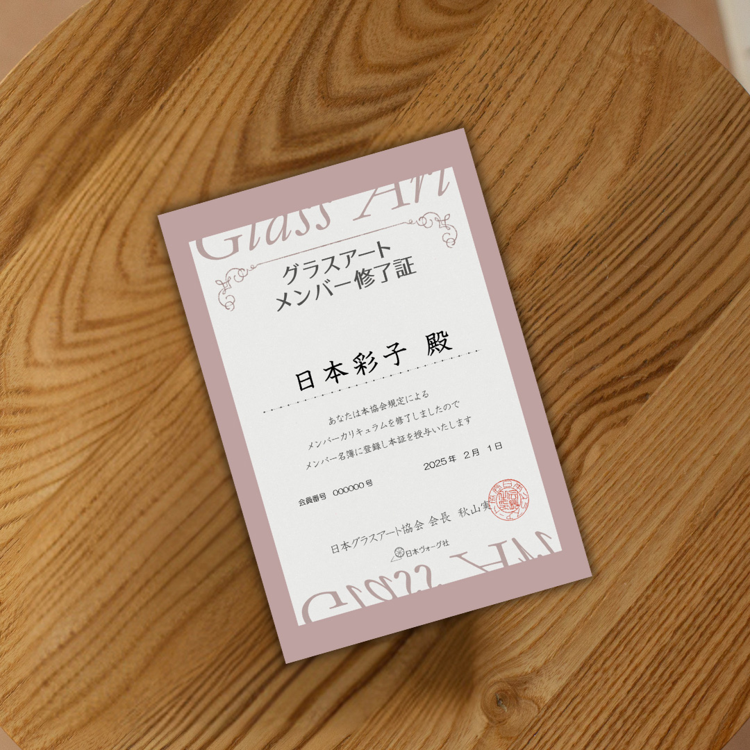 グラスアートメンバー資格取得の申請と日本グラスアート協会へ入会することができます(申請料11,000円、年会費1,100円が別途必要)。