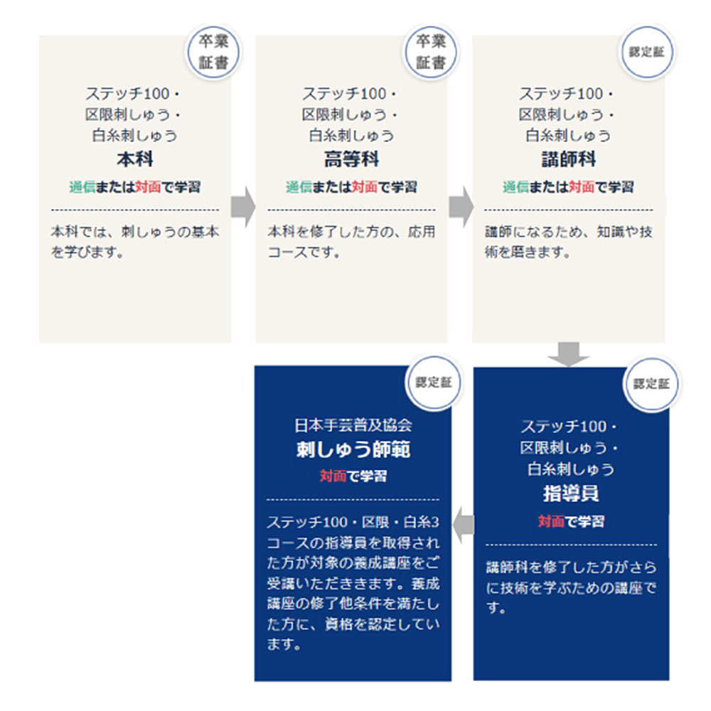資格は本科から始まり、講師資格が得られる講師科、さらに指導員、師範とステップアップをめざせます。 通信講座では講師科まで学習することができます。 ※本科の次のステップ「講師科」は、専用アプリ内で購入、受講します。