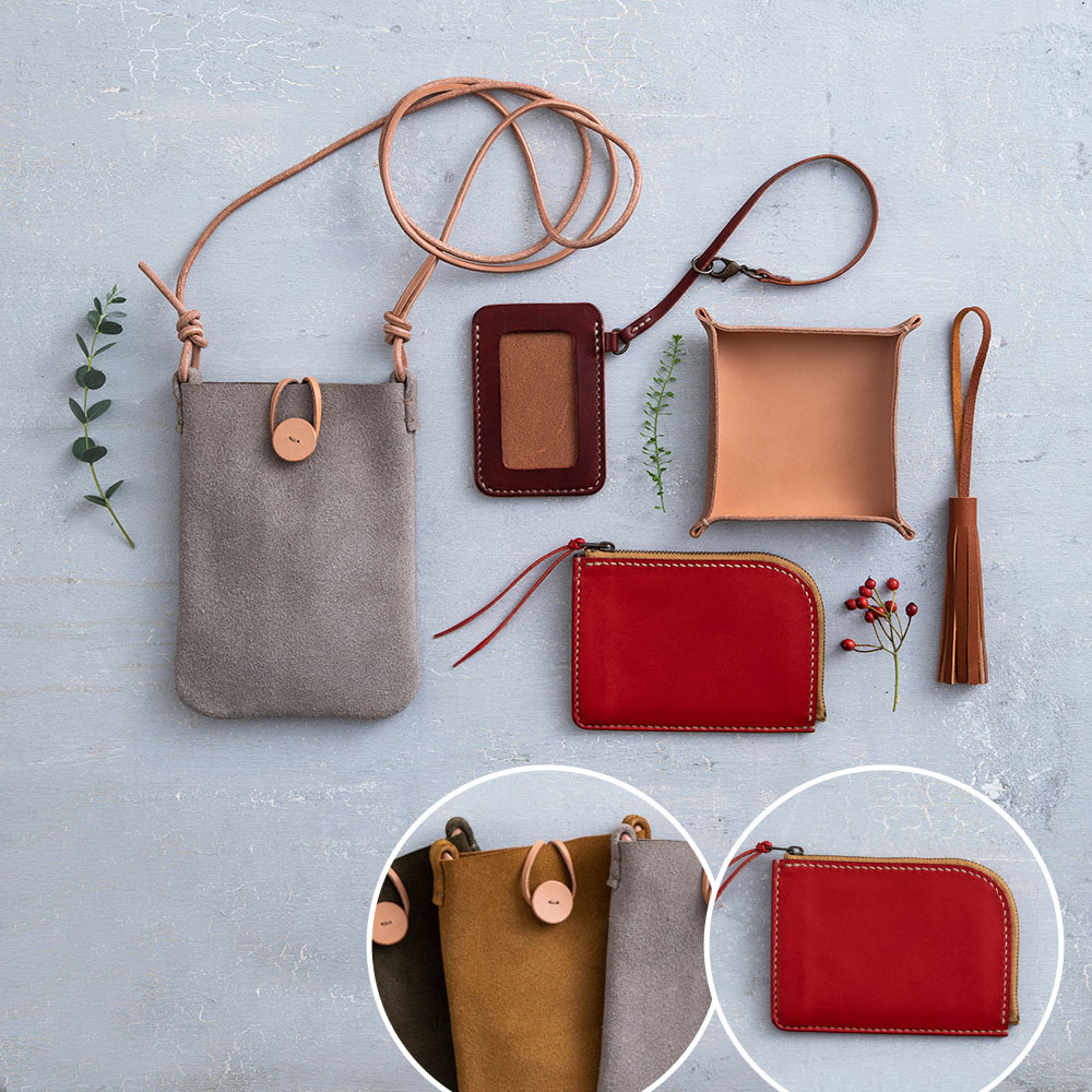 カリキュラム自体が、作品を順を追って作っていくと少しずつ技術や知識が身に付いていくように開発されているので、楽しく作っているだけでレザークラフトが上達します。しかもどれも使いたくなる作品ばかり。一部の作品の革の色や、糸色も16色から選んでお好みで仕立てられるので、作った後も一層愛着が沸きます。