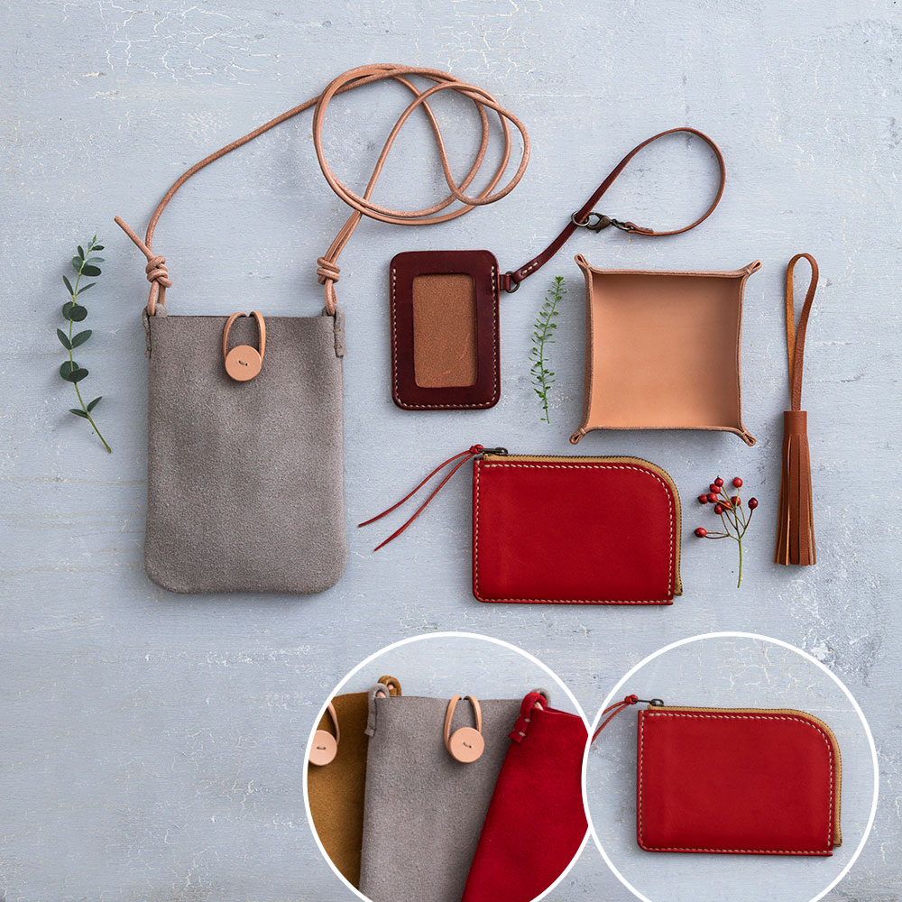 カリキュラム自体が、作品を順を追って作っていくと少しずつ技術や知識が身に付いていくように開発されているので、楽しく作っているだけでレザークラフトが上達します。しかもどれも使いたくなる作品ばかり。一部の作品の革の色や、糸色も16色から選んでお好みで仕立てられるので、作った後も一層愛着が沸きます。