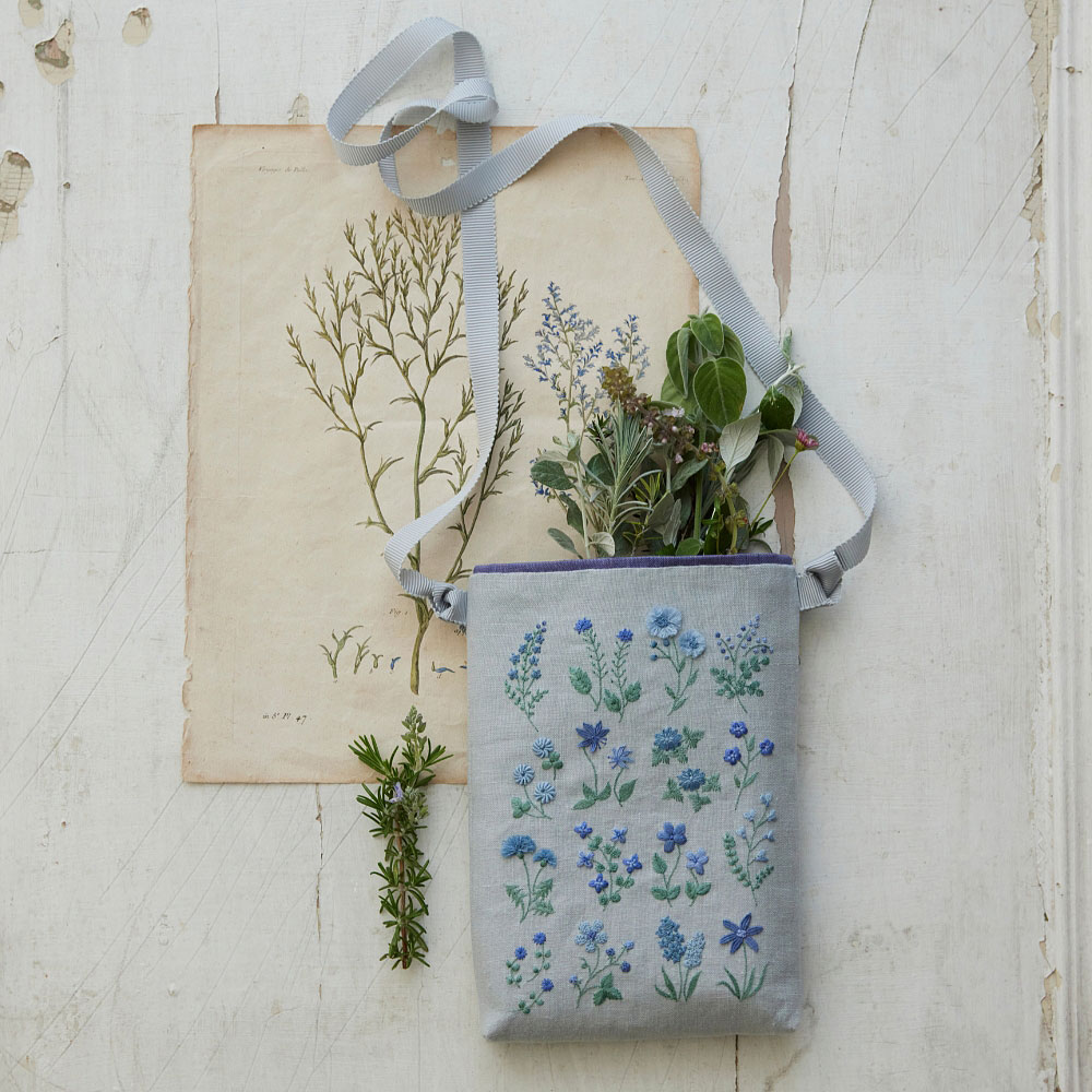 ブルー系のおしゃれなサコッシュに小さくて可愛い春の草花16種類が勢ぞろい。