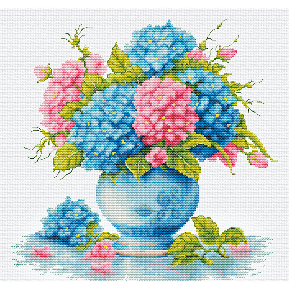 【キット作り方つき】花瓶にいけたピンクとブルーの瑞々しいアジサイを描いた、エレガントなクロスステッチ作品です。上級の方向け。Luca-S社製。