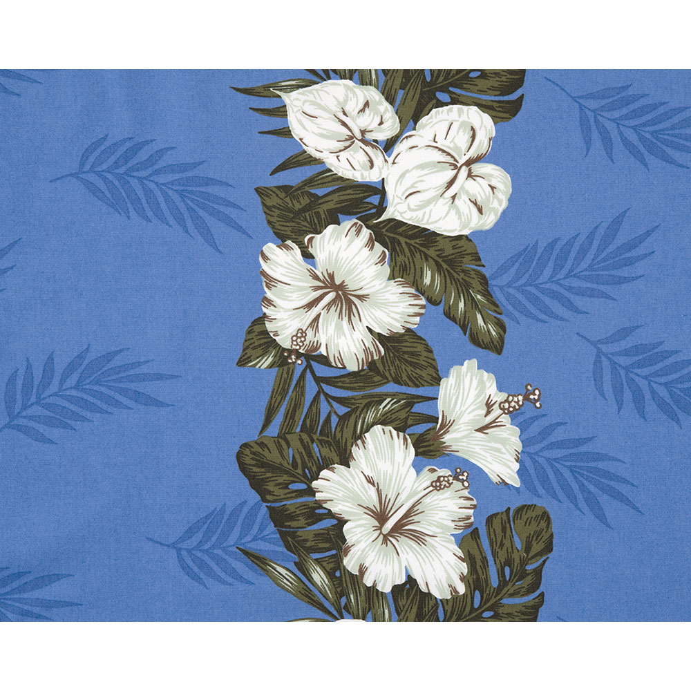 [広幅][ブロード]ヤシの葉のシルエット描いたブルー地に、布端から約35cmの所にハイビスカスのボーダー入った広幅プリント。ムームーやハワイアンドレス、インテリアなどに。