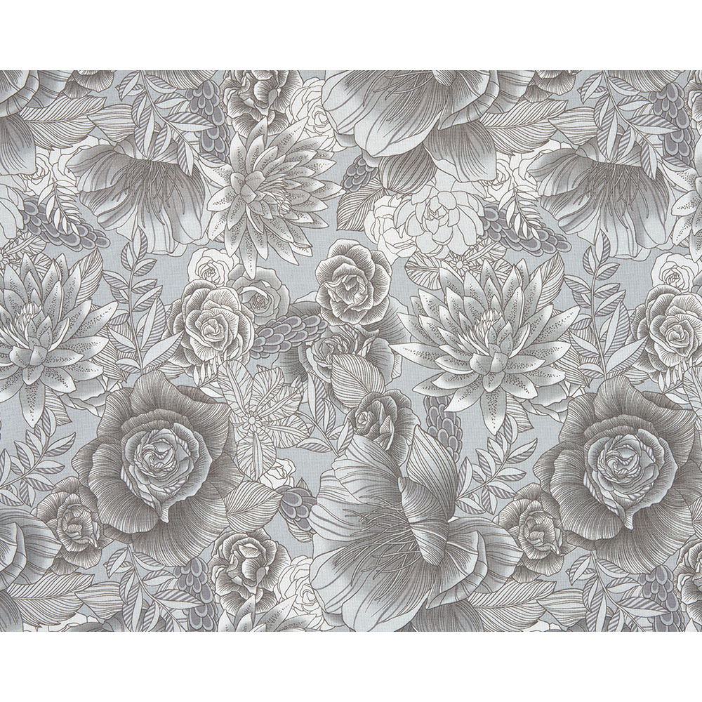 動きのある大胆な花を繊細な線描で描きました。ぼかした色合いでプリント。裏布などに。