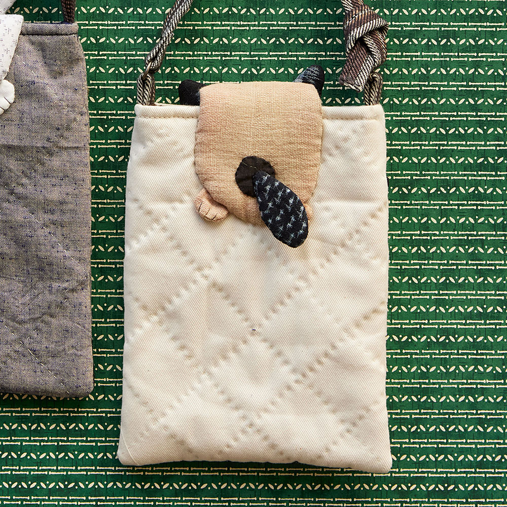 【キット作り方つき】【古裂】フラップ部分がそれぞれウサギやネコの顔になった、2種のユニークなショルダーバッグです。マグネットボタンで開閉します。後ろ側にはそれぞれの後ろ姿をアップリケします。