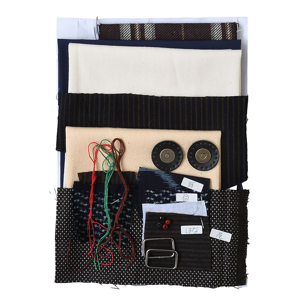 表布・裏布(古裂他)、刺し子糸、マグネットボタン、目用ボタン、ウッドビーズ、Dカン