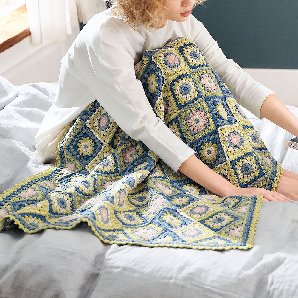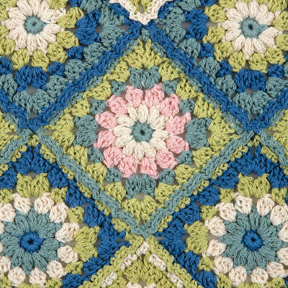 ●キット・作り方つき●モチーフつなぎの王道、ブランケット。モネの睡蓮をイメージしたカラーリングがとても 綺麗です。シャリ感のあるコットンリリヤーンでさらりとした肌触りが心地いい。スクエアモチーフをまっすぐにつなぐことも多いブランケットですが、斜めに配置することで動きが生まれ、順番通りにつなぐことで、つなぎ目も立体的な模様になります。