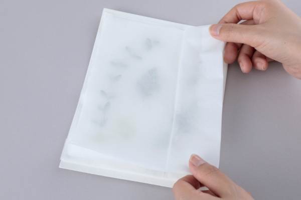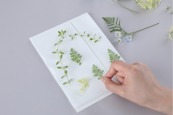 1 ドライシートの上にティッシュペーパーを敷き、その上に植物を置きます。