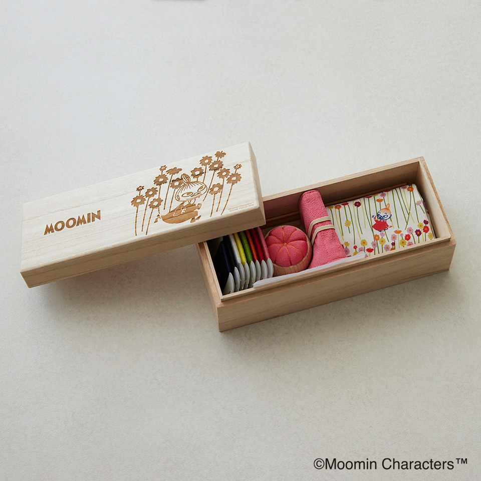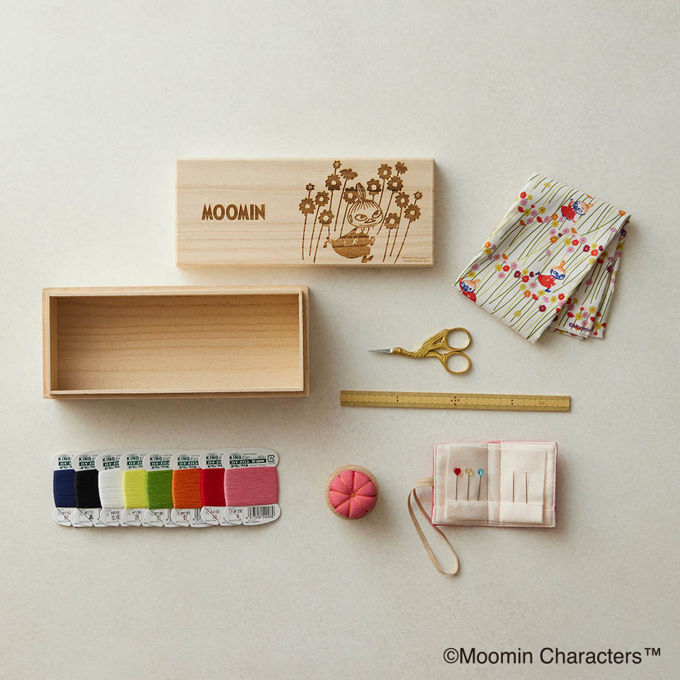 桐箱、針山、ニードルブック、まち針(3本)、本縫い針(2本)、ボタン付け糸(8色/ピンク・赤・オレンジ・黄緑・レモン・白・黒・紺)、20cm竹尺、糸切りはさみ、リトルミイ柄布(約 幅50×送り50cm)