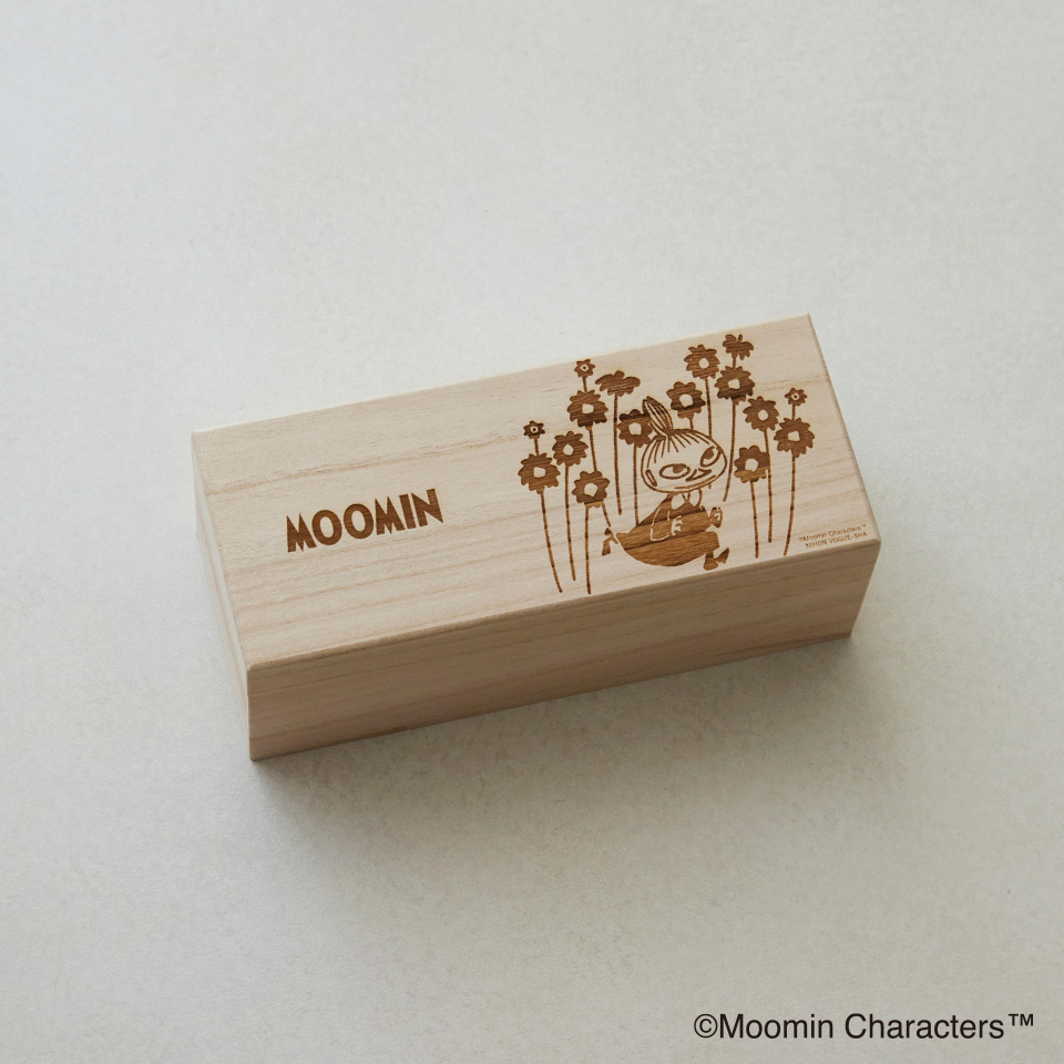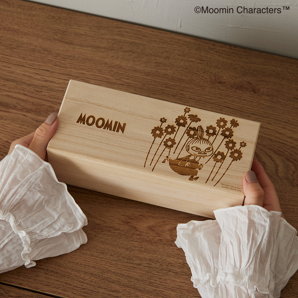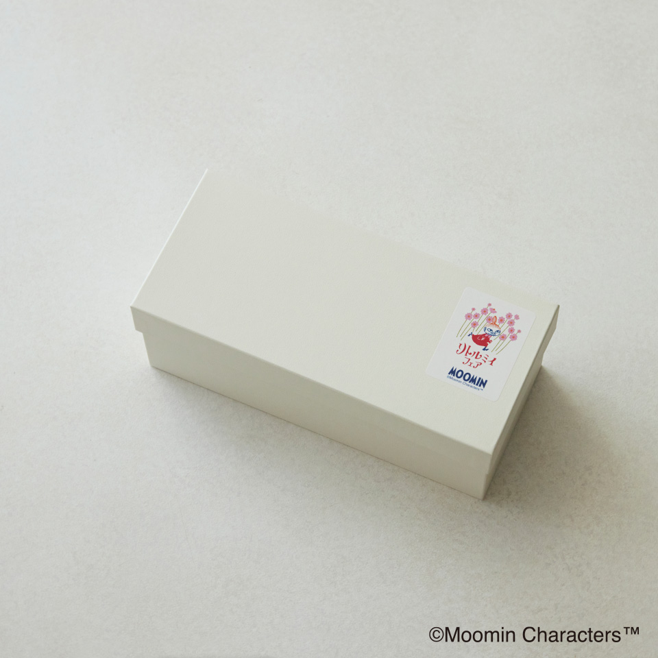 少し和テイストで豪華なお裁縫道具セットです。桐箱の蓋には、リトルミイフェア2025のアートがレーザー彫刻でプリントされています。桐箱の中には限定アートをプリントした、オリジナル生地が入っています。ちょっとした布小物を作れるくらいの大きさです。お家にひとつあると嬉しいお裁縫道具のセットです。