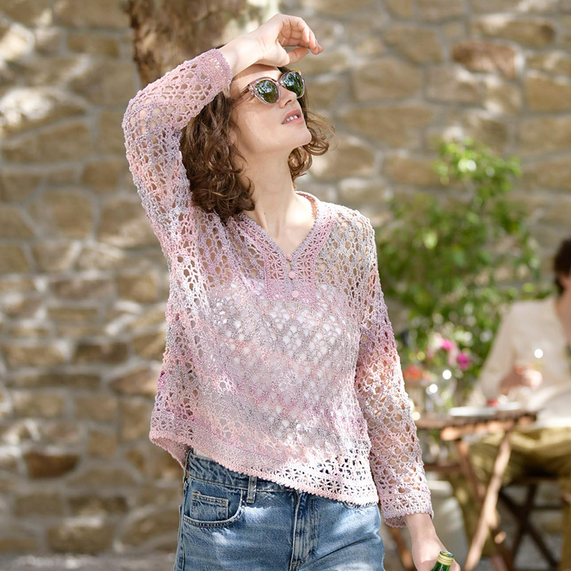 柔らかな印象の段染め糸はピンク系を選んで春らしく。程良いシャリ感のあるドライタッチの涼やかな糸で、パプコーン編みを斜めに並べてダイヤ柄の透かし模様を作ります。衿ぐりに花模様を並べたような、Vあきのヘンリーネックが新鮮です。