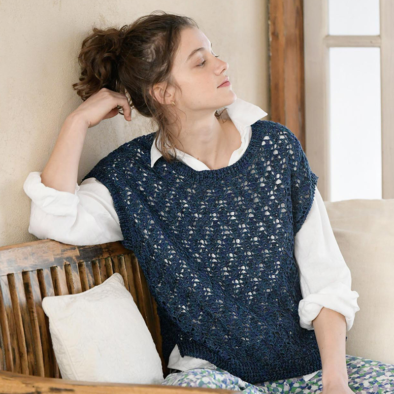 単調にならないミックスヤーンでニュアンスを加えたクロッシェベスト。脇はまっすぐの編みやすいタイプです。脱ぎ着や重ね着を考えて、衿ぐりは大きめにあけています。ワンピースやスカートにもよく合う万能選手です。