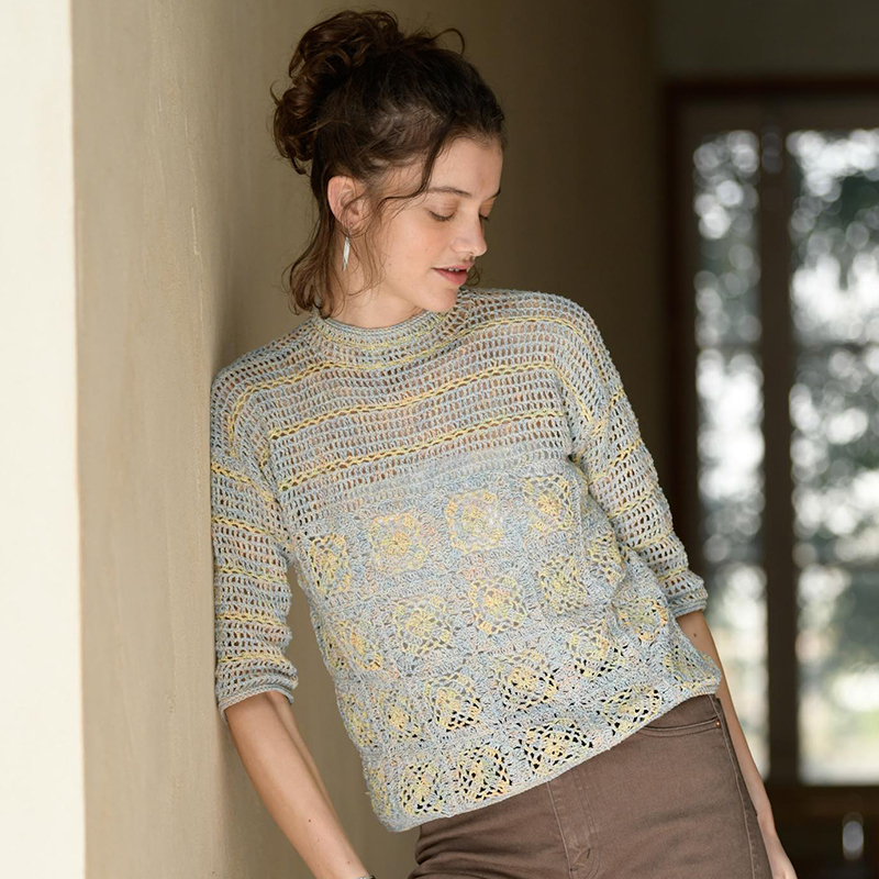 穏やかに色が変化する段染め糸を2色使ってシンプルなモチーフを編んでつなぎ、別に編んだヨーク部分と巻きかがって仕上げます。衿ぐりは後ろあきにしてボタン留めに。ハイネックなので、衿元のあいた服が苦手な方に特におすすめ。