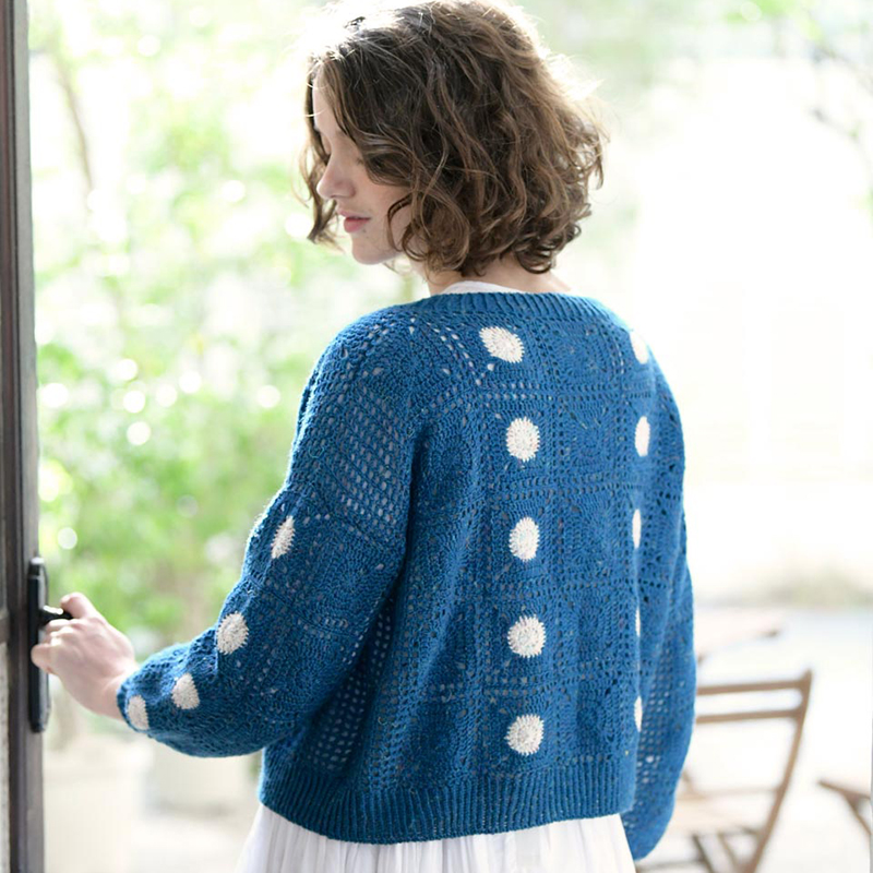 ウールですが、リネン混紡で春先のまだ肌寒い時期にぴったりのカーディガン。配色モチーフと単色モチーフの配置の仕方を工夫して、モチーフの中心にドットを浮き上がらせたデザインが秀逸です。方眼編みとの組み合わせや棒針での仕上げなど、ちょっとしたところにセンスが光ります。