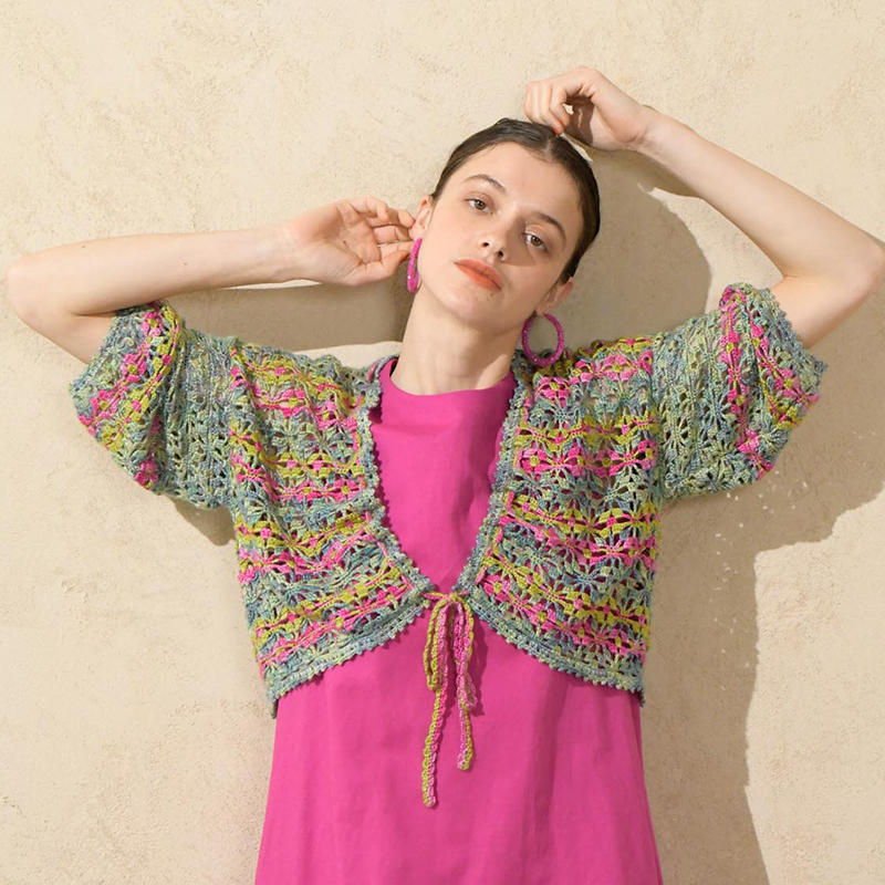 材料:マラブリゴ モラ 緑系段染め(416Indiecita)175g/4カセ、ピンク(057EnglishRose)・黄緑(037Lettuce)各50g/各1カセ。