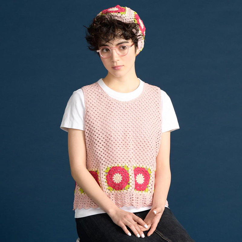 インパクトのある色鮮やかな多弁の花モチーフを1列だけ並べ、シンプルな模様ですっきりとまとめました。(このレシピはベストのみです。)