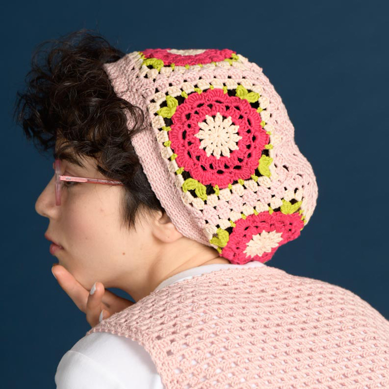 インパクトのある色鮮やかな多弁の花モチーフを1列だけ並べ、シンプルな模様ですっきりとまとめました。(このレシピは帽子のみです。)