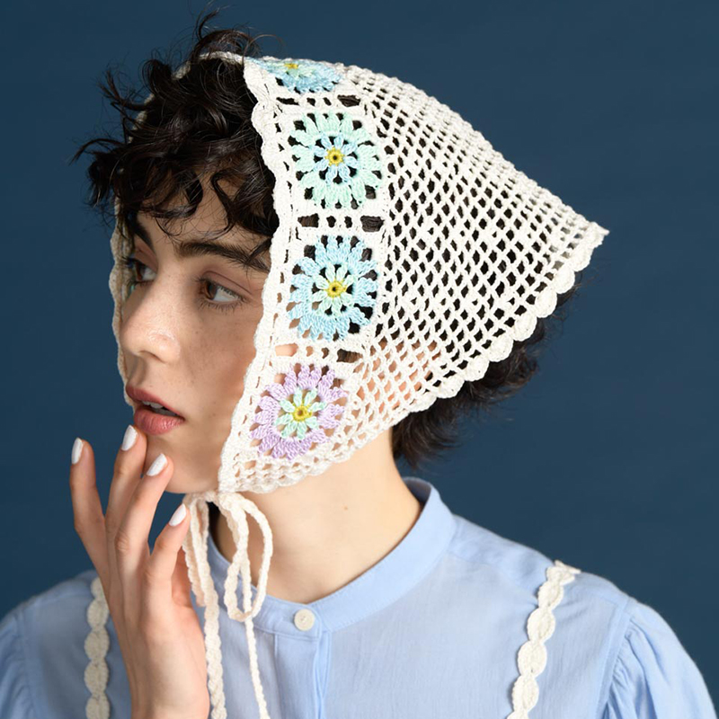 爽やかカラーの小花モチーフバブーシュカ。中心の花色を揃え、外側の花びらを3色で展開した四角いモチーフをつないでいます。トレンドのY2Kファッションにぴったり。懐かしくて新しい今どきアイテムです。(このレシピはバブーシュカのみです。)