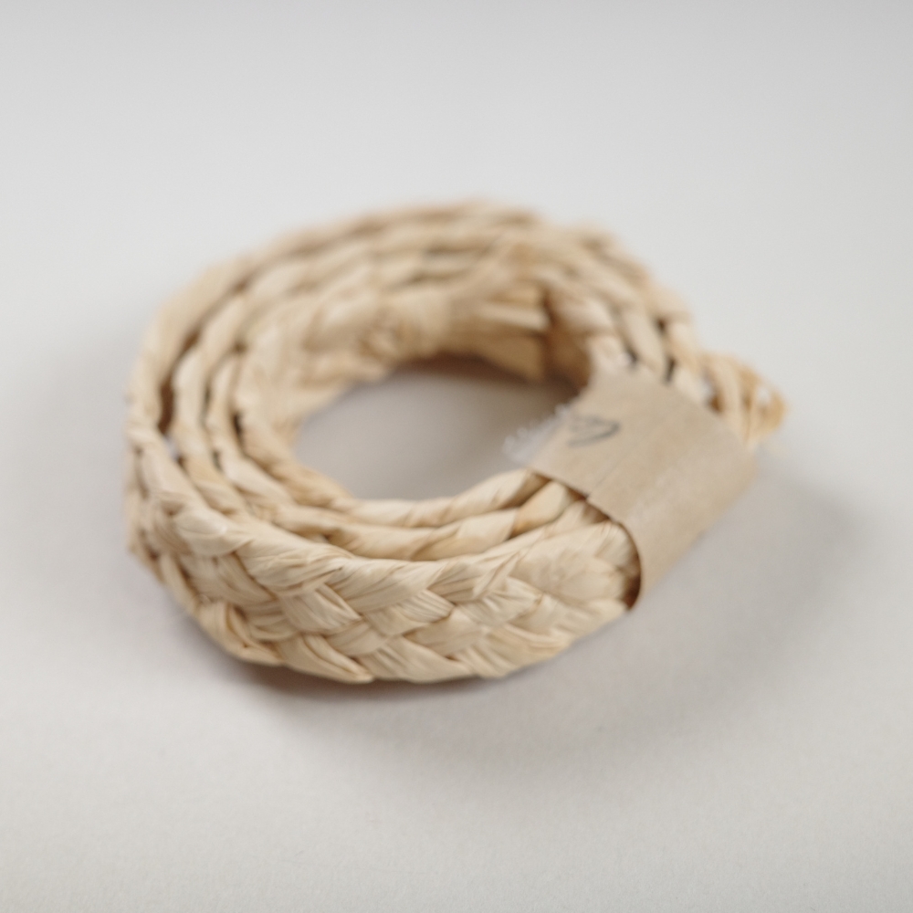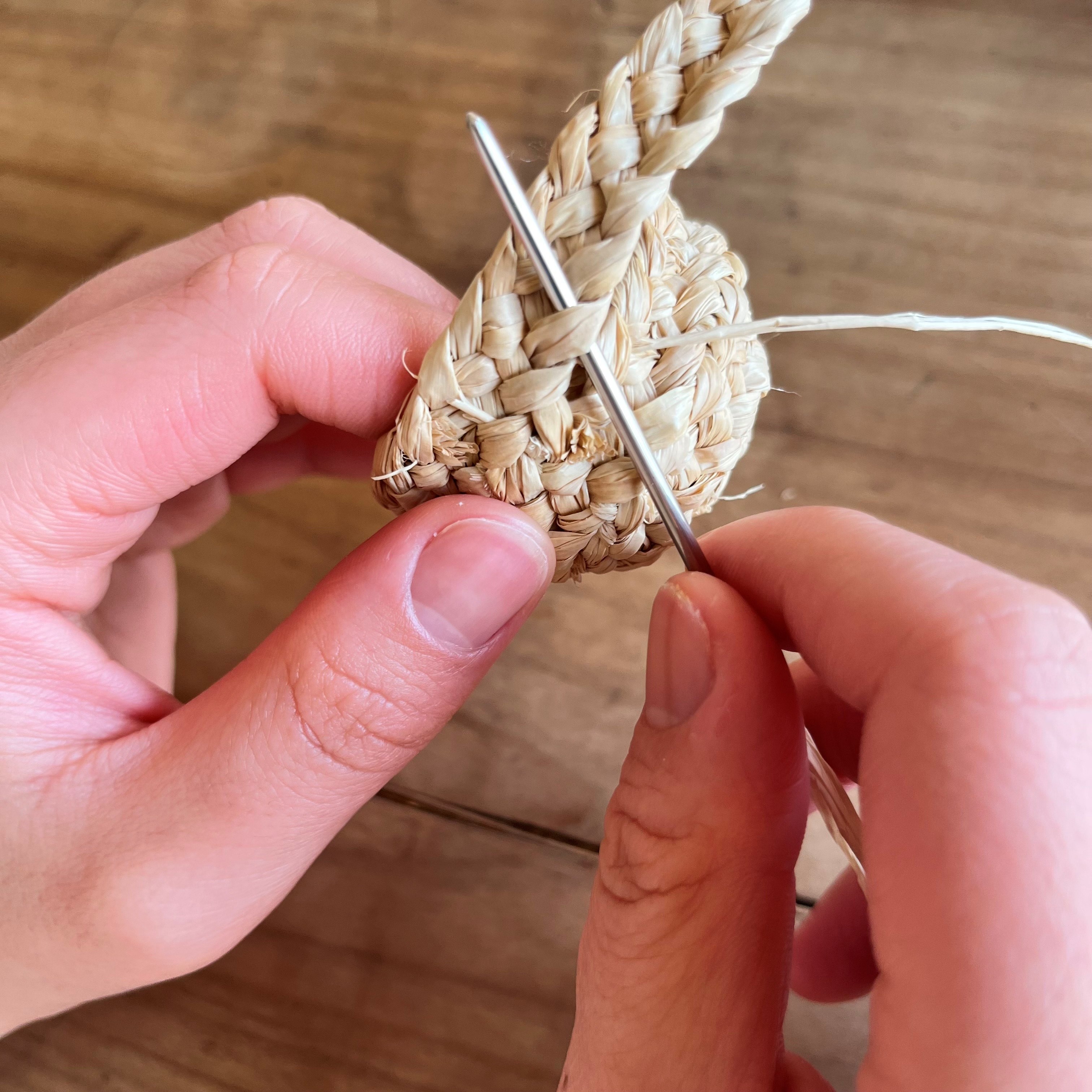 編み込まれたラフィアのブレードをとじ針でとじていき底と側面を作ります。最後にラフィアロープの持ち手も縫い付けて小さなバスケットの完成です。編まずに付属の針とラフィアの糸で作ることができます。
