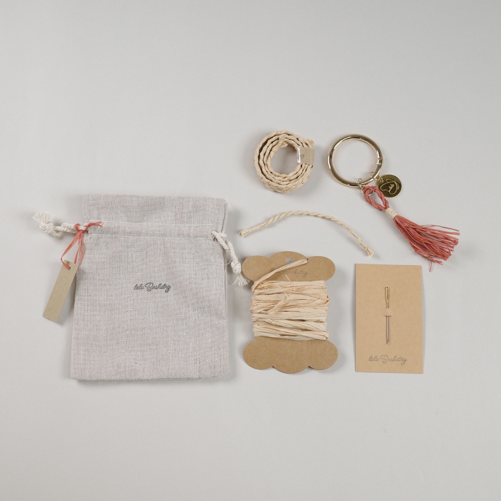 ラフィア(ブレード、とじ用ラフィア、ハンドル用ラフィアロープ)、とじ針、カラビナ、タッセル、ロゴチャーム