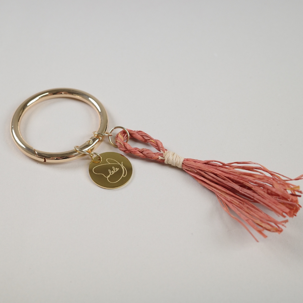 ラフィアのかご編み教室を運営している「lolo Basketry」のオリジナルチャーム付きです。重厚感のあるゴールドのカラビナと、蘇芳染(すおうぞめ)をされたピンク色のラフィアで作られたタッセルもセットになっています。バスケットの本体に使用するラフィアは編み込まれたものが用意されているので簡単にチャレンジできます。