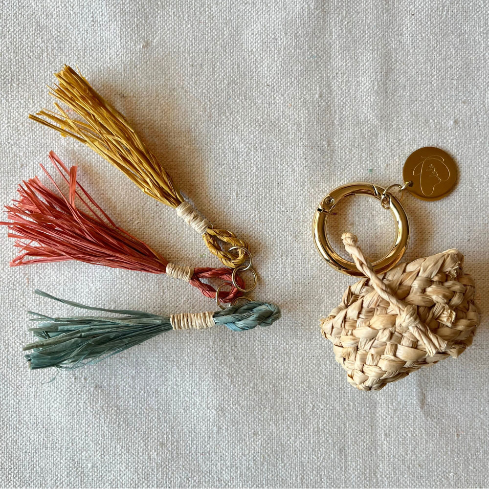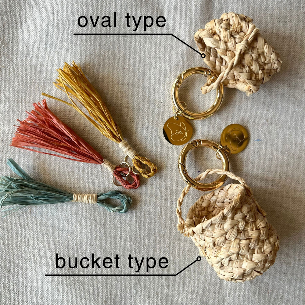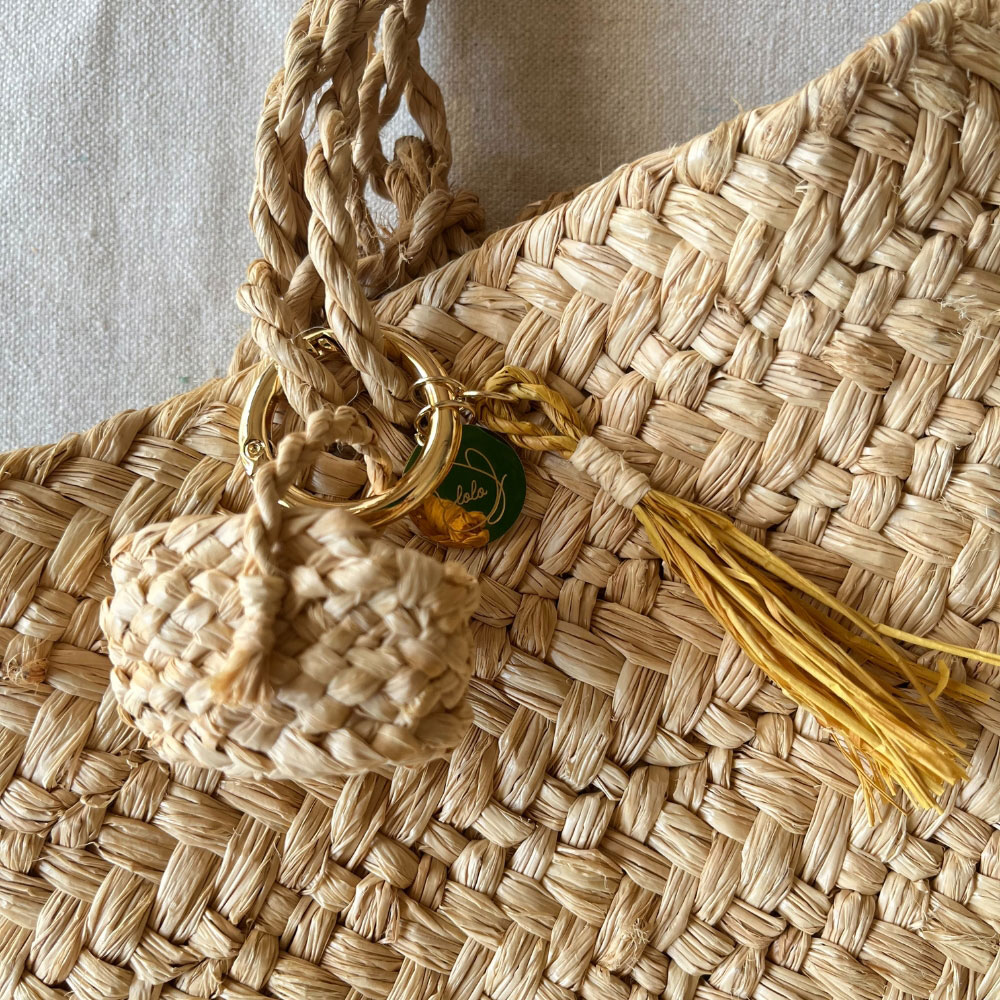 ラフィアのかご編み教室を運営している「lolo Basketry」のオリジナルチャーム付きです。重厚感のあるゴールドのカラビナと、インド玉ねぎ染をされたイエローのラフィアで作られたタッセルもセットになっています。バスケットの本体に使用するラフィアは編み込まれたものが用意されているので簡単にチャレンジできます。