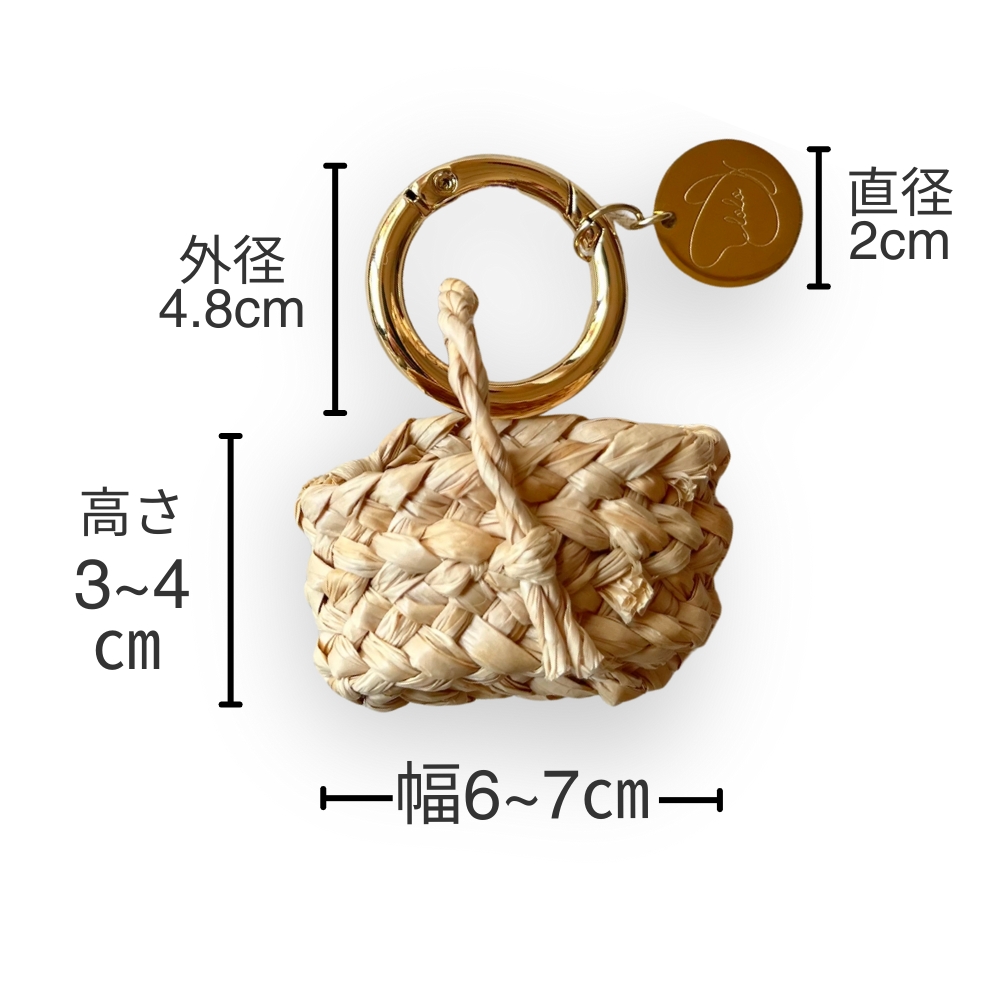 - 天然繊維のラフィアで作られたバスケットと、カラビナとオリジナルのロゴチャームで上品な仕上がりです