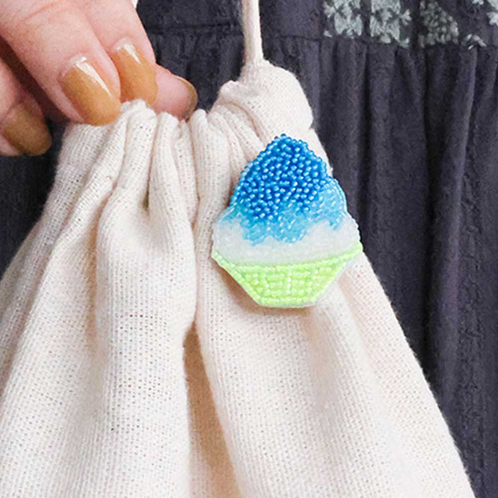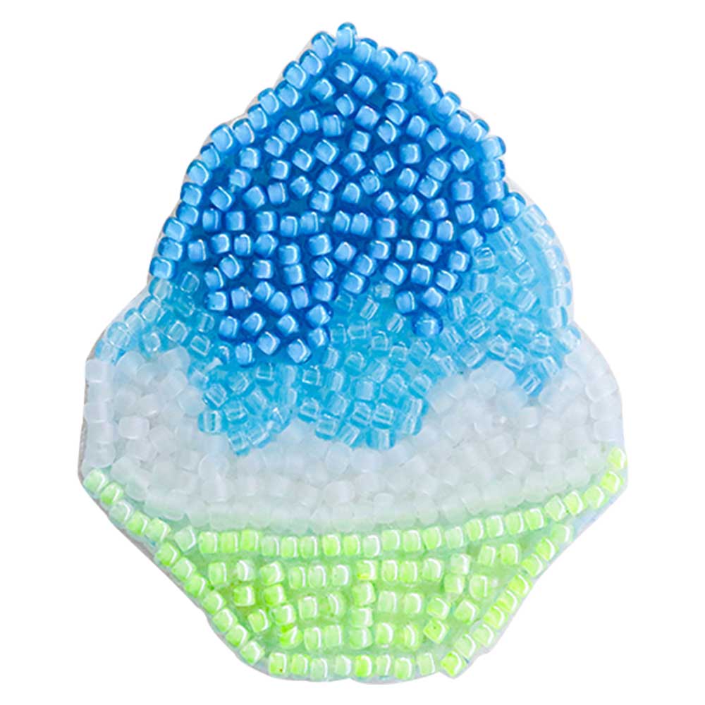 【キット作り方つき】 見ているとおなかがへりそうな、しずる感のある小さめのブローチです。刺しゅう枠を使わず、フェルトに直接刺してつくる、ビーズ刺しゅうのブローチ。図案が印刷済みなので、すぐに刺し始めることができます。ギラギラした太陽のしたで食べるキンキンのかき氷は格別。舌が真っ青になるけれど、見た目に涼しいブルーハワイで。