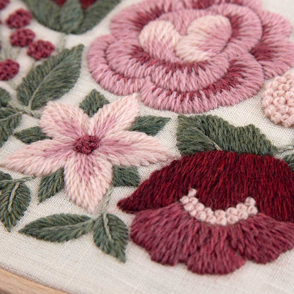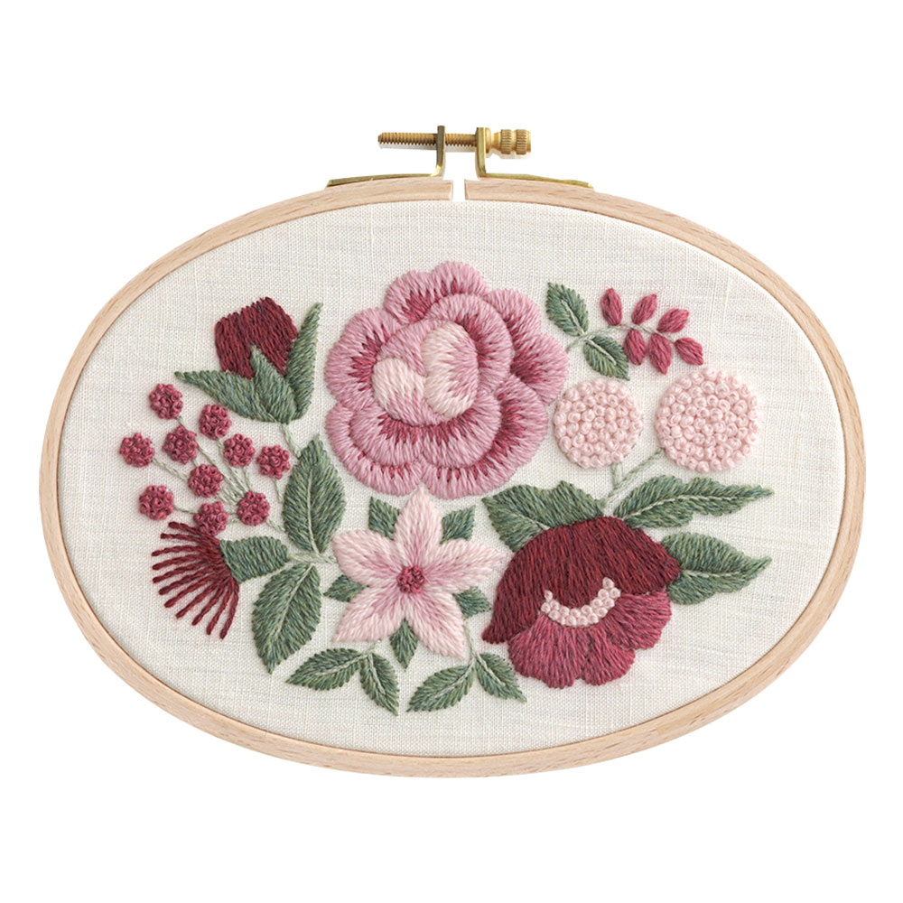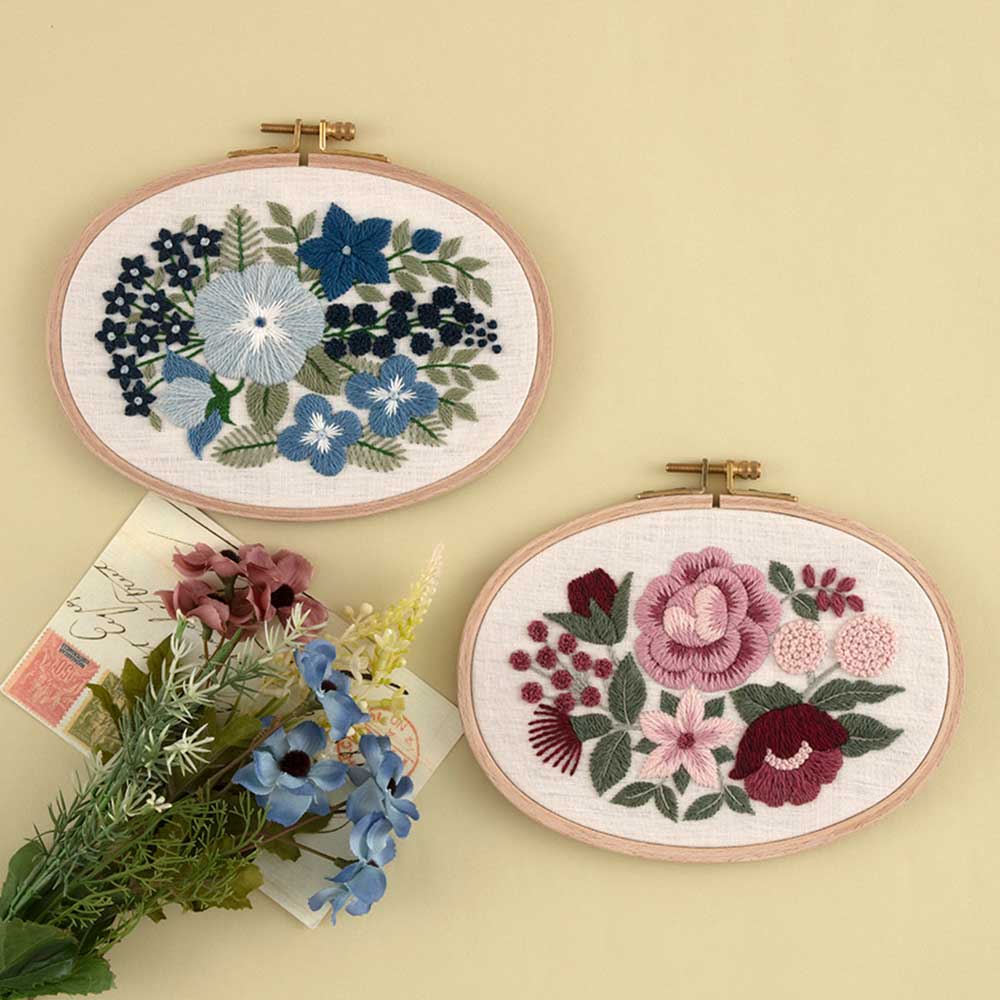 「赤は情熱、ピンクは陽気さを、黄色は爽やかに、オレンジは素朴、青は瑞々しく、そして紫は儚さを。色の持つ性格や特徴、感覚を花束に仕立ててオーバル型の刺しゅう枠に詰め込みました。ウール糸と25番糸の相性の良い組み合わせは、立体感をより際立たせ魅力をましています。糸の持つあたたかな質感と自然から生まれた染色を、ぜひ体感して頂ければと思います。刺しゅうを暮らしの中に取り入れて、心豊かになれる刺しゅう時間をどうぞお過ごしください。」