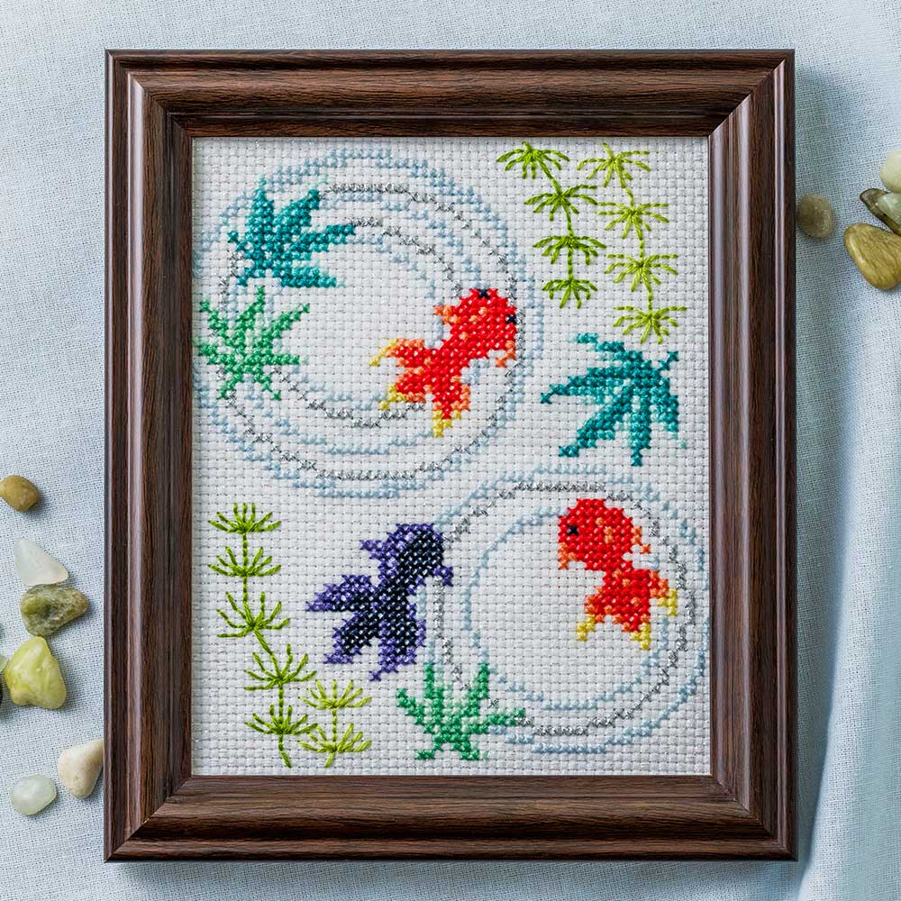 【キット作り方つき】【フレームつき】ラメ糸がキラキラと上品に輝く刺しゅう布に、金魚や青紅葉をクロスステッチする涼し気なデザインです。フレームつきなので、作ってすぐに飾ることができます。初~中級の方向き。部分的にシルバーのラメ糸も使うので、キラキラ感がプラスされます。