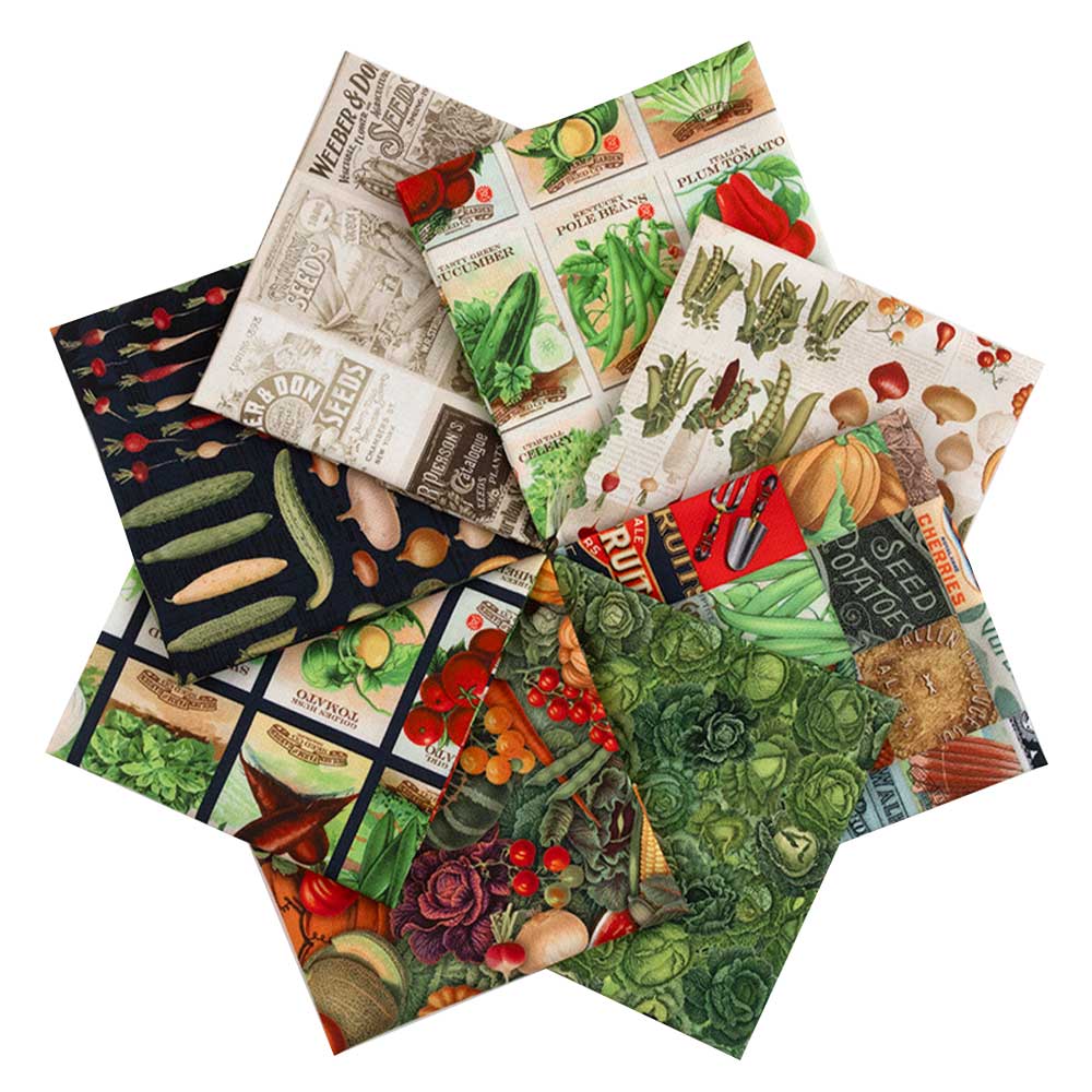 【USA】 色とりどりの野菜や、ヴィンテージのシードパックやパンフレットのデザインをモチーフにした、カラフルで楽しいカットクロスセットです。
